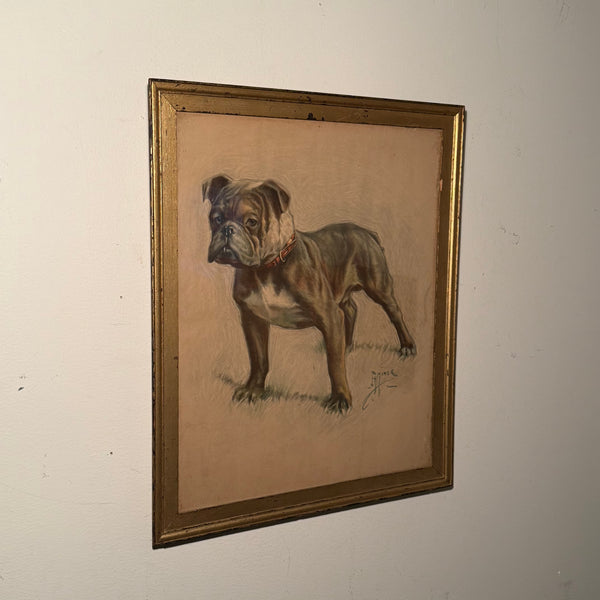 The framed antique bulldog print measures 24 1/2” x 20 1/2”. The paper has the expected toning of a 100-year-old survivor. The backing board shows honest storage wear that hasn't touched the print itself. The frame is missing a few pieces of gilt. It’s an original bruiser, and it’s perfect. Please see all pics as they are part of the description.
