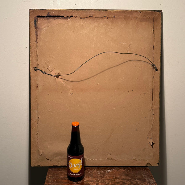 The print is housed in its original, battered gilt wood frame. We haven't touched it. The chips in the wood and the honest loss of gold leaf are exactly where they should be—evidence of a century spent watching the world get worse. It’s held under old glass with the original, moisture-stained backing board still intact. We’re offering this in as-found condition. If you want something pristine, look elsewhere.