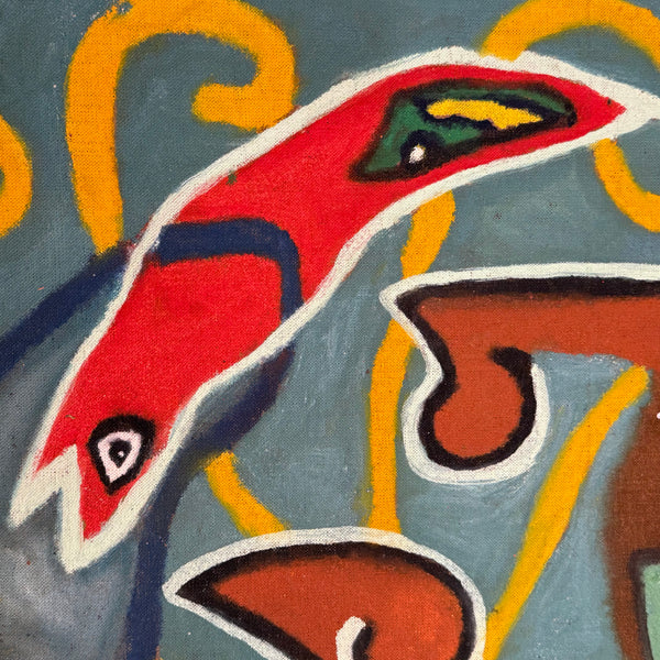 The paintings feature an awesome "Cobra-esque" aesthetic—a movement known for its spontaneous, child-like expression and bold palettes, First we have a whimsical, mask-like face with piercing red eyes and swirling yellow flourishes. Then we have the second abstract composition of organic, biomorphic shapes, including what appears to be a stylized fish and geometric eyes. We have some wild ones! Both pieces are finished in a moody, teal-green background that makes the primary reds and yellows pop.
