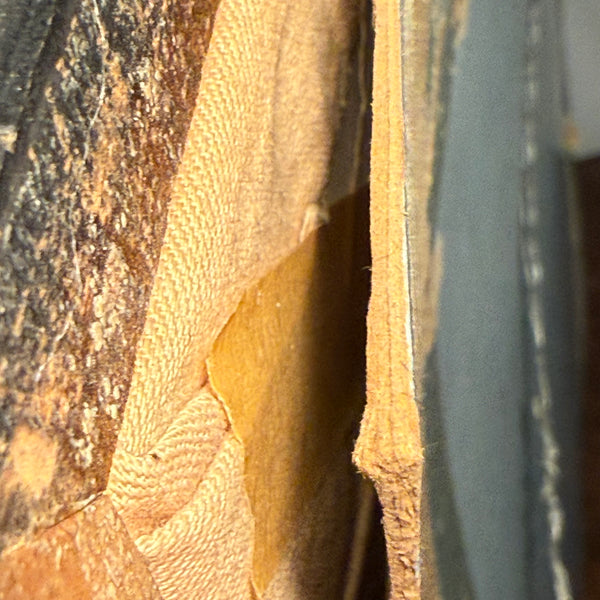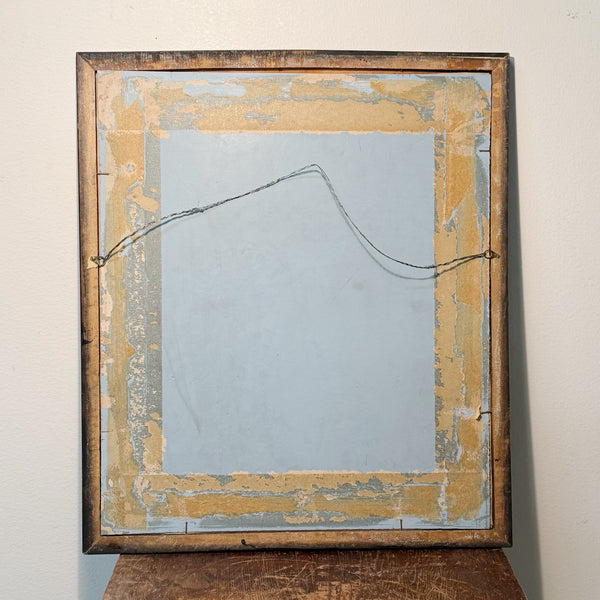 The framed antique tramp measures 20 1/2” tall by 17 1/2” wide. The old folk art is in decent condition for its age, still showcasing vibrant colors against the aged light gold ground fabric. The is general wear across the entire piece. The textile is wrapped around the backing board but the looseness is producing waves. The piece is sold AS IS. Please see all pics as they are part of the description.