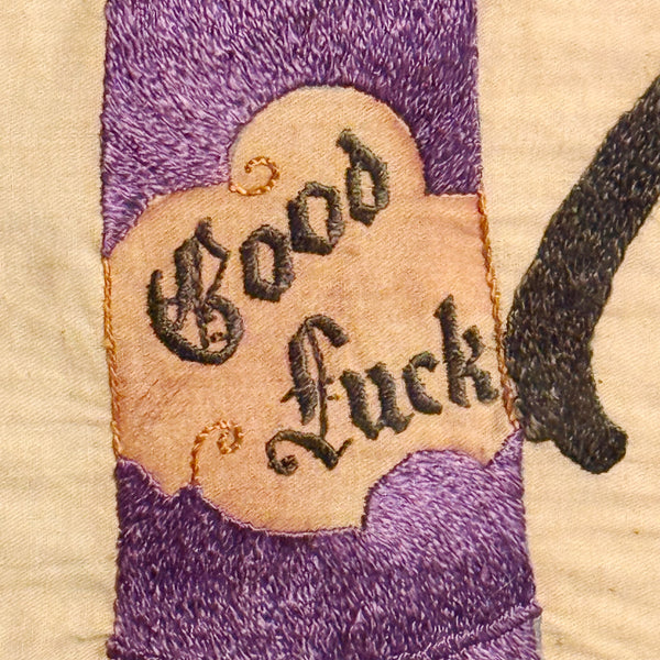 Here we have a roaring and highly unique piece of early 20th-century folk art embroidery, likely dating from the 1910s to the 1930s. If you want to declare your joint as the ultimate party spot, this folk art is the way to do it. A genuine piece of Americana, this textile served as a hearty and spirited welcome sign, rich with symbolism of luck, fellowship, celebration, a plenty of good feelings. The hand-stitched textile embodies the themes of "good times" and hospitality. The bold, simple stitching style, reminiscent of Sailor's Souvenir Art or Tramp Art, suggests it may have been created by a soldier, sailor, or perhaps an inmate as a pastime—a way to send a message of home and friendship.