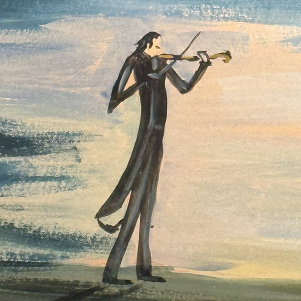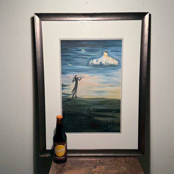 Here we have an early, original surrealist painting by the renowned Israeli artist, Meir Pichhadze. As soon as this beauty entered my vision, I was overloaded with visions of Tim Burton and Edward Scissorhands. When you research Mr. Pichhadze, this scene won’t surprise you. He’s known for his unique blend of symbolic, surreal, and sometimes naive styles. Well, there you have it. Check out the  mysterious night scene: a lone violinist in a black tuxedo stands in a dark, atmospheric landscape, playing his music for a woman sitting atop a cloud. This dreamy, symbolic composition evokes themes of longing, isolation, and romanticism.
