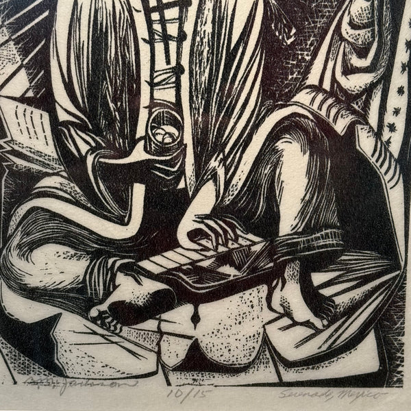 When I say rare, I mean rare. This one is #10 of 15. The woodcut print is signed and titled “Serenade, Mexico” in pencil on the lower border. The artwork was likely made in the 1950s. The artwork came out of a highly esteemed Chicago art collector’s estate.